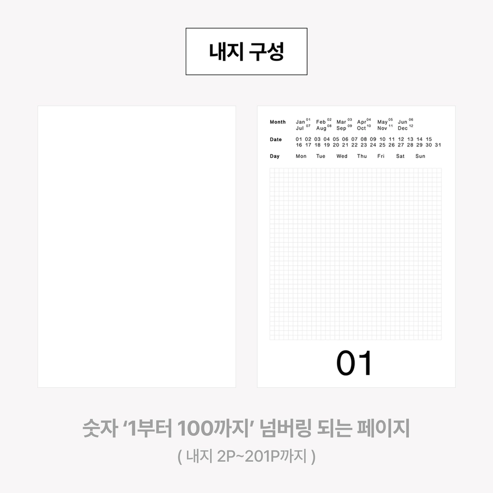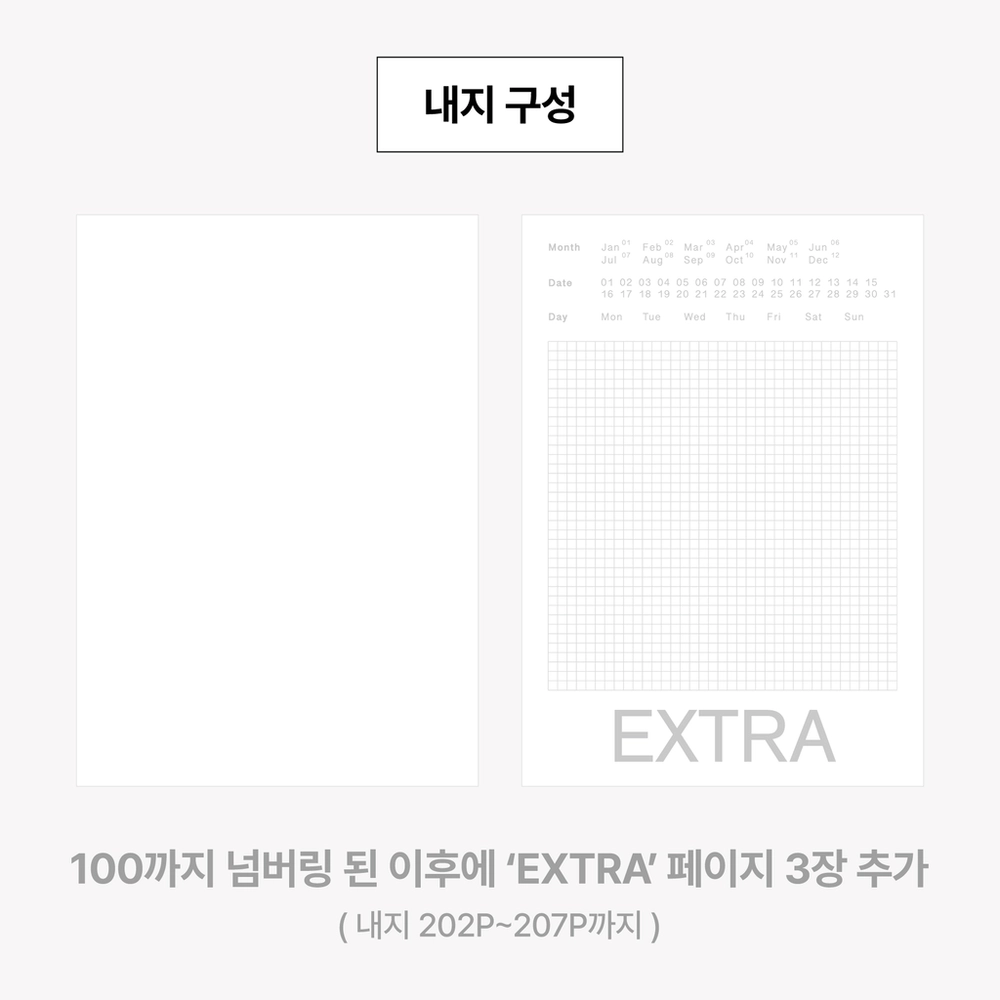 * 본 노트는 ‘1부터 100까지’ 넘버링 된 100장의 페이지와 추가 에피소드를 기록할 수 있는 ‘EXTRA’ 페이지 3장으로 구성되어 있습니다.