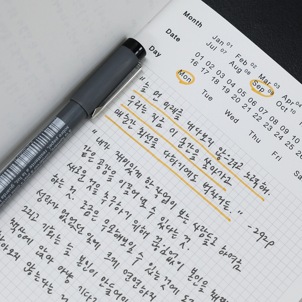 내지는 120g의 도톰한 종이가 사용되었으며, 우측 면에만 인쇄가 되어 있기 때문에 뒷면 비침에 대한 염려를 하지 않아도 됩니다. 또, 180도로 펼쳐지는 제본 방식으로 제작되어 보다 효율적인 필기를 돕습니다. 표지는 300g의 두께감 있는 종이 위에 무광 코팅을 더해 더욱 견고하며 필요에 따라 별도의 PVC 커버를 구입하여 사용할 수 있습니다.