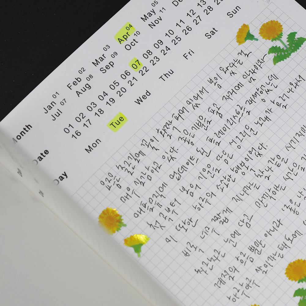상단에 있는 월 • 일 • 요일을 체크한 뒤, 모눈 위에 가벼운 형식의 일기나 매일의 생각들, 공감가는 글귀 등을 기록할 수 있고, 간단한 스크랩 용도로도 활용할 수 있습니다.
